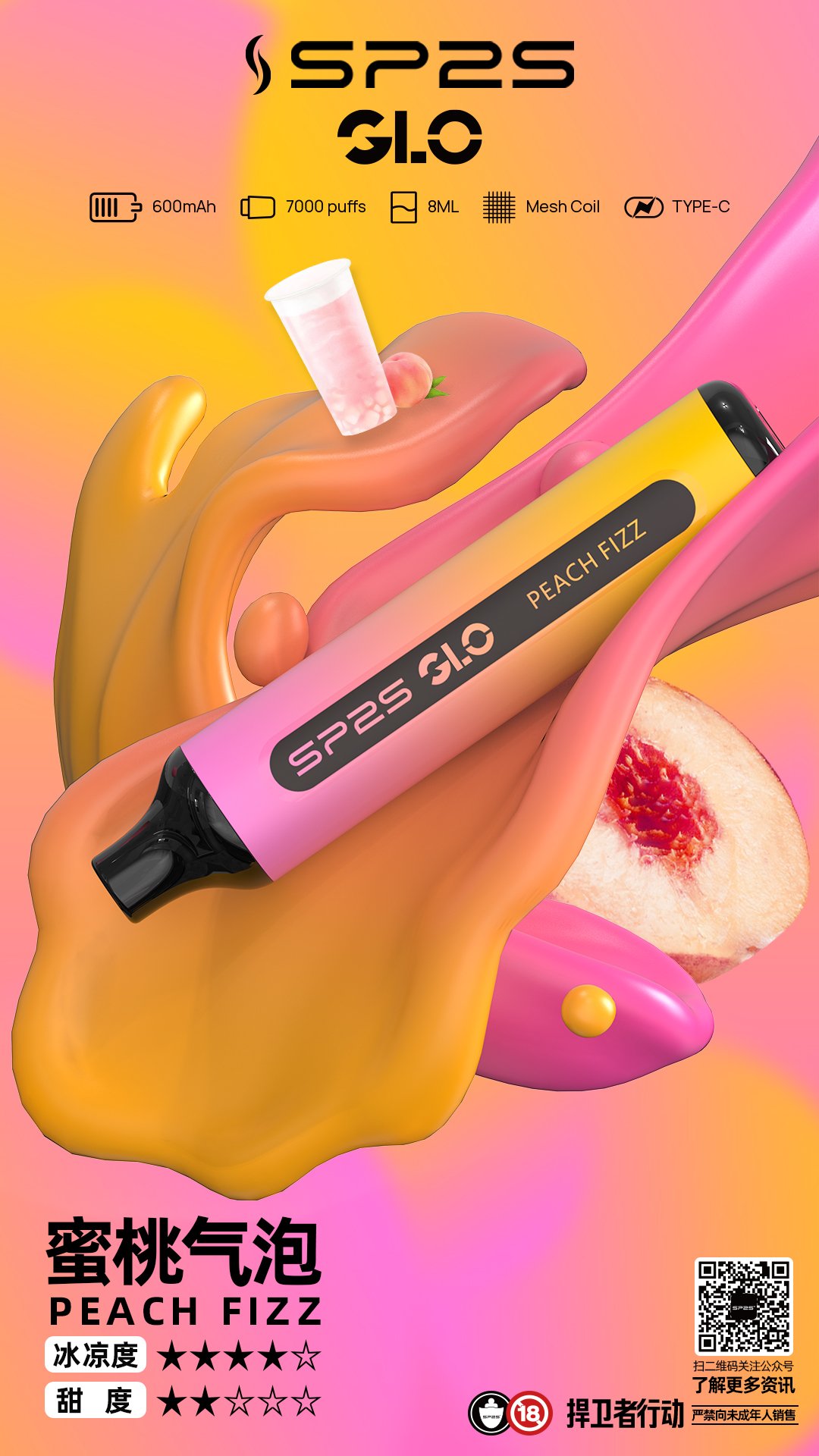 SP2S GLO 7000口霧化器|持久穩定輸出 暢享大煙量搭載8mL特大煙油與600mAh高效電池,單支可吸約7000口,滿足長時間使用需求。全系列涵蓋15種風味,囊括水果、冰爽、茶飲與特色飲品,為不同偏好的使用者提供更多選擇。